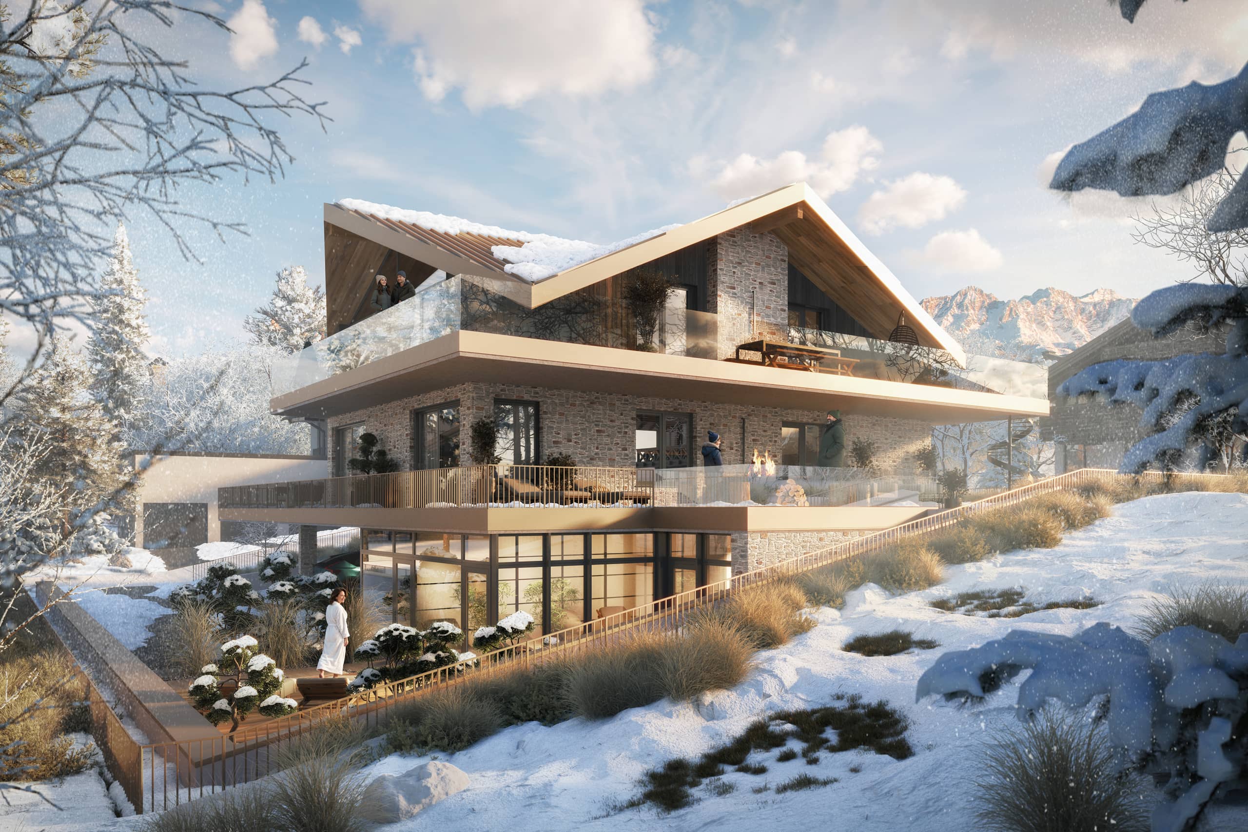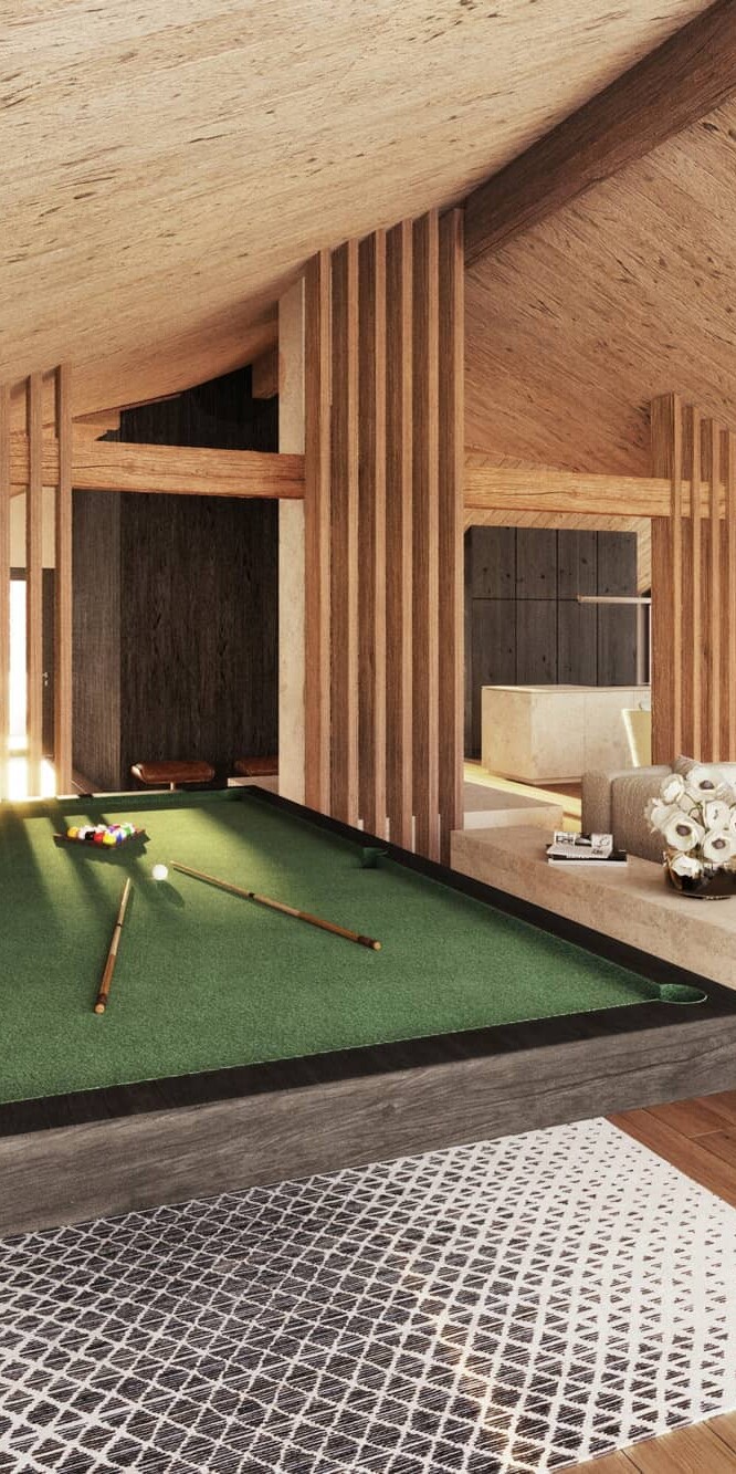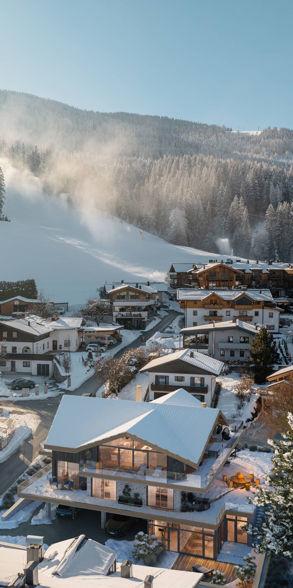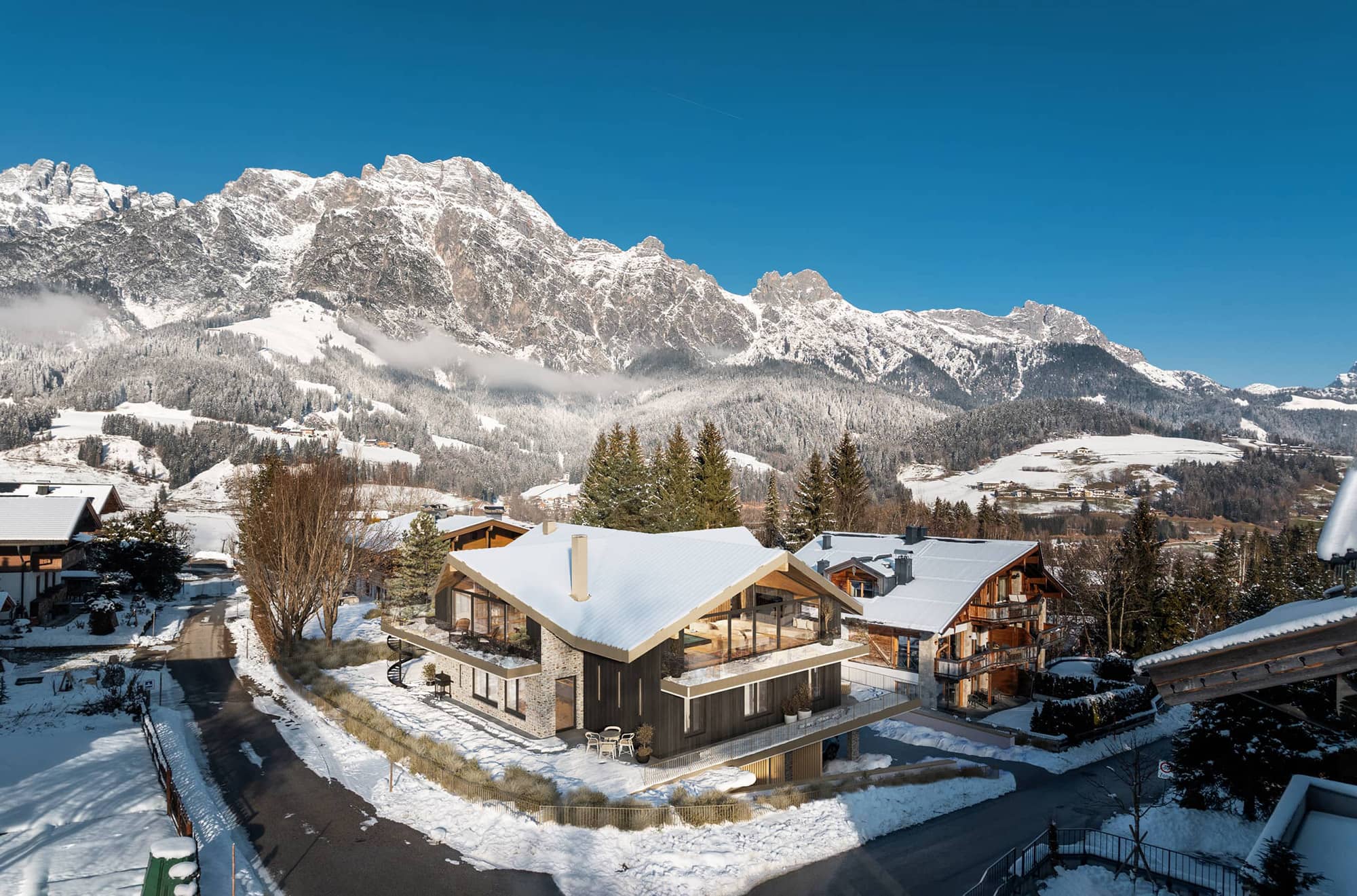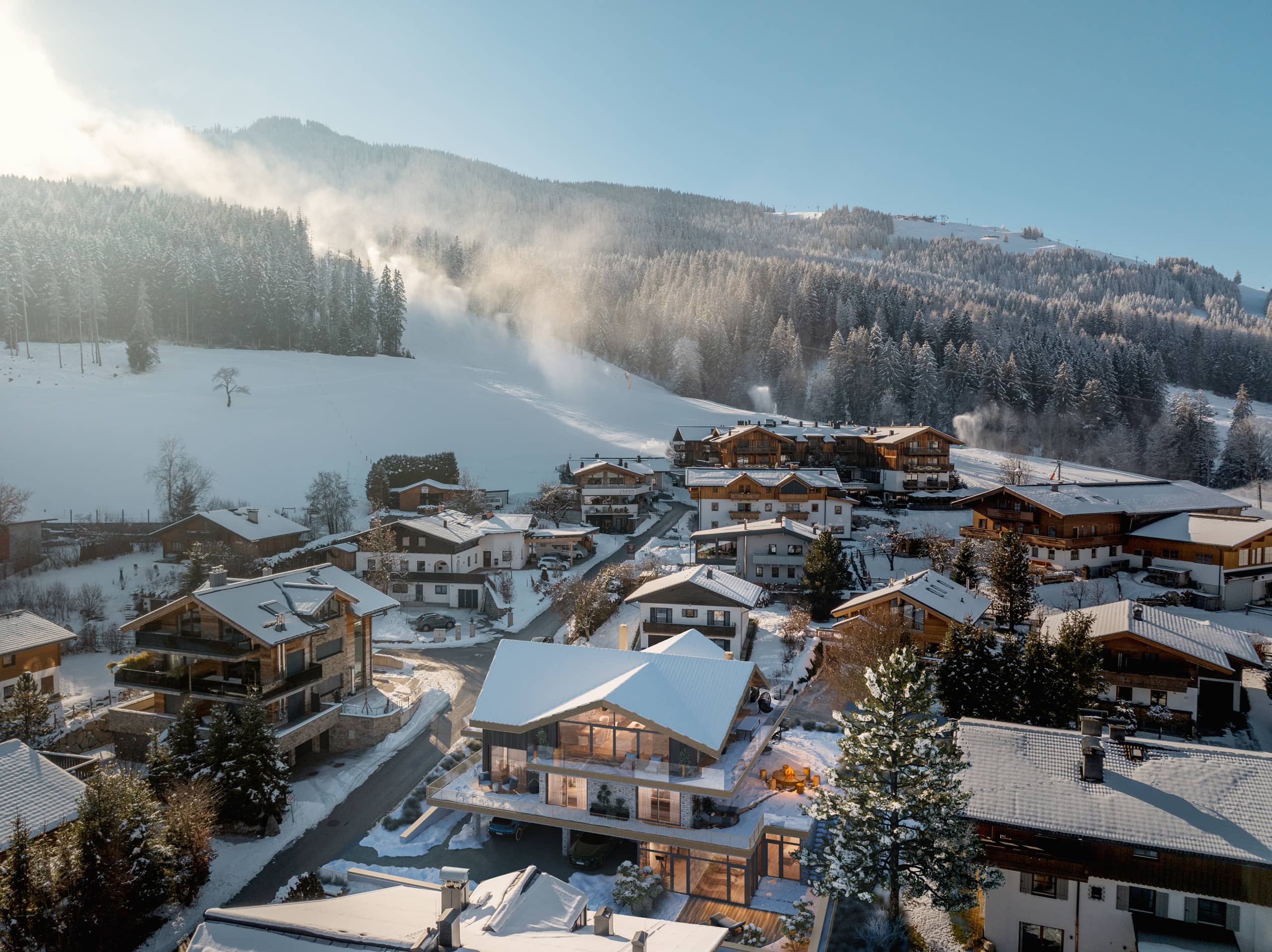 Hier trifft architektonische Großzügigkeit auf alpine Gemütlichkeit: ein offener Kamin, eine (optionale) maßgefertigte Küche, ein Spiel aus Licht und Material. Die Terrassen umfassen den Raum wie ein Amphitheater und öffnen den Blick auf die Leoganger Steinberge.