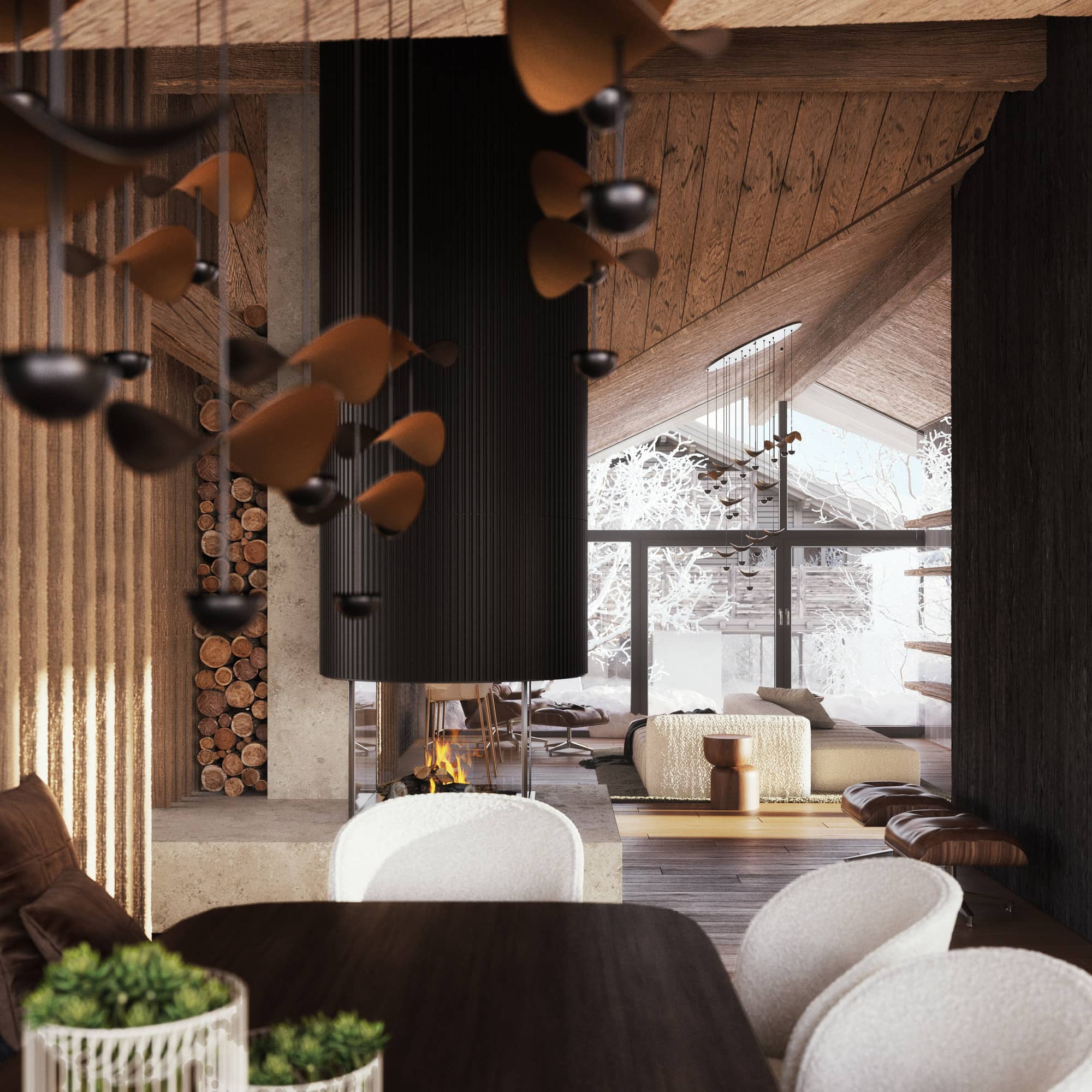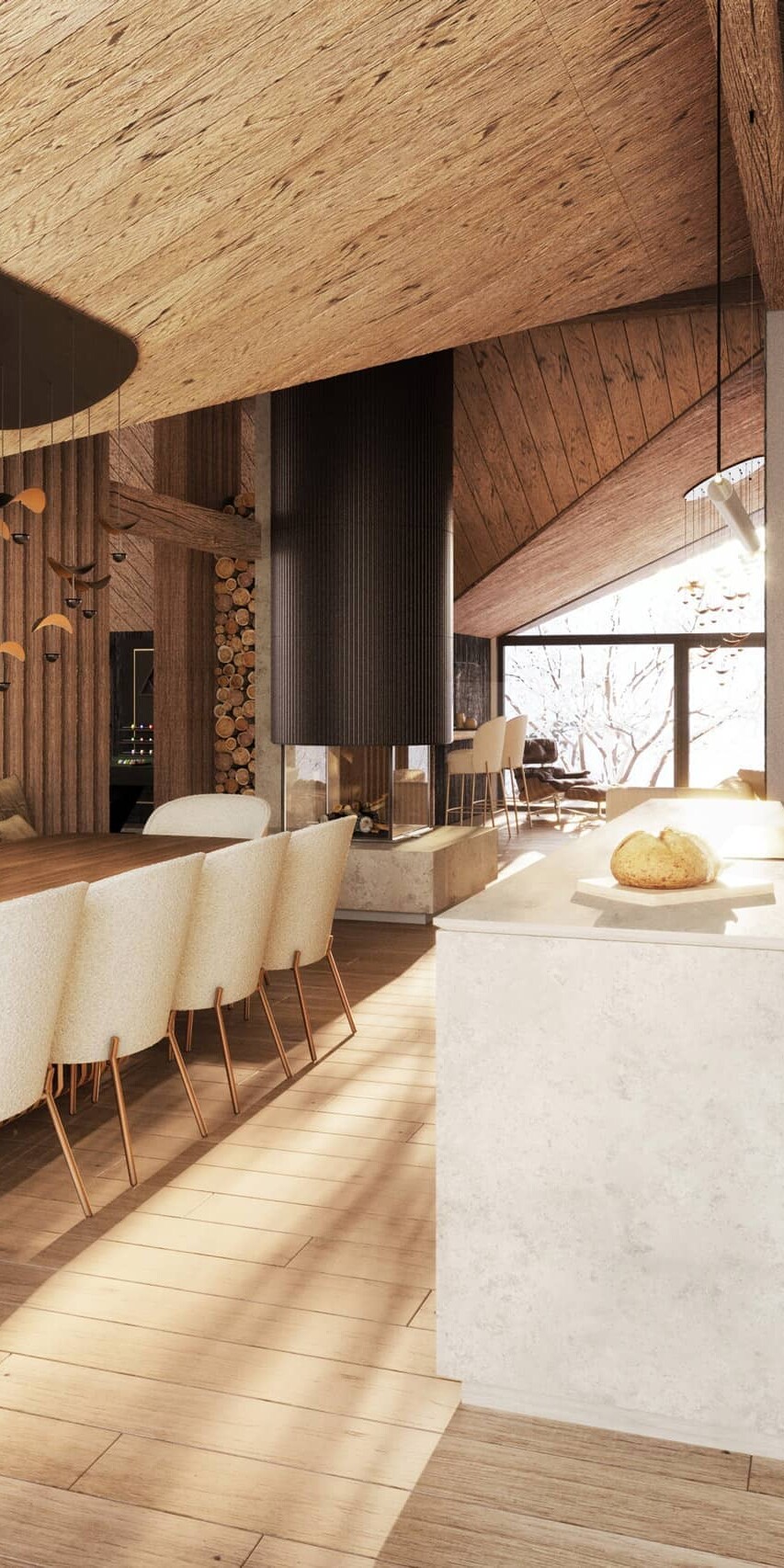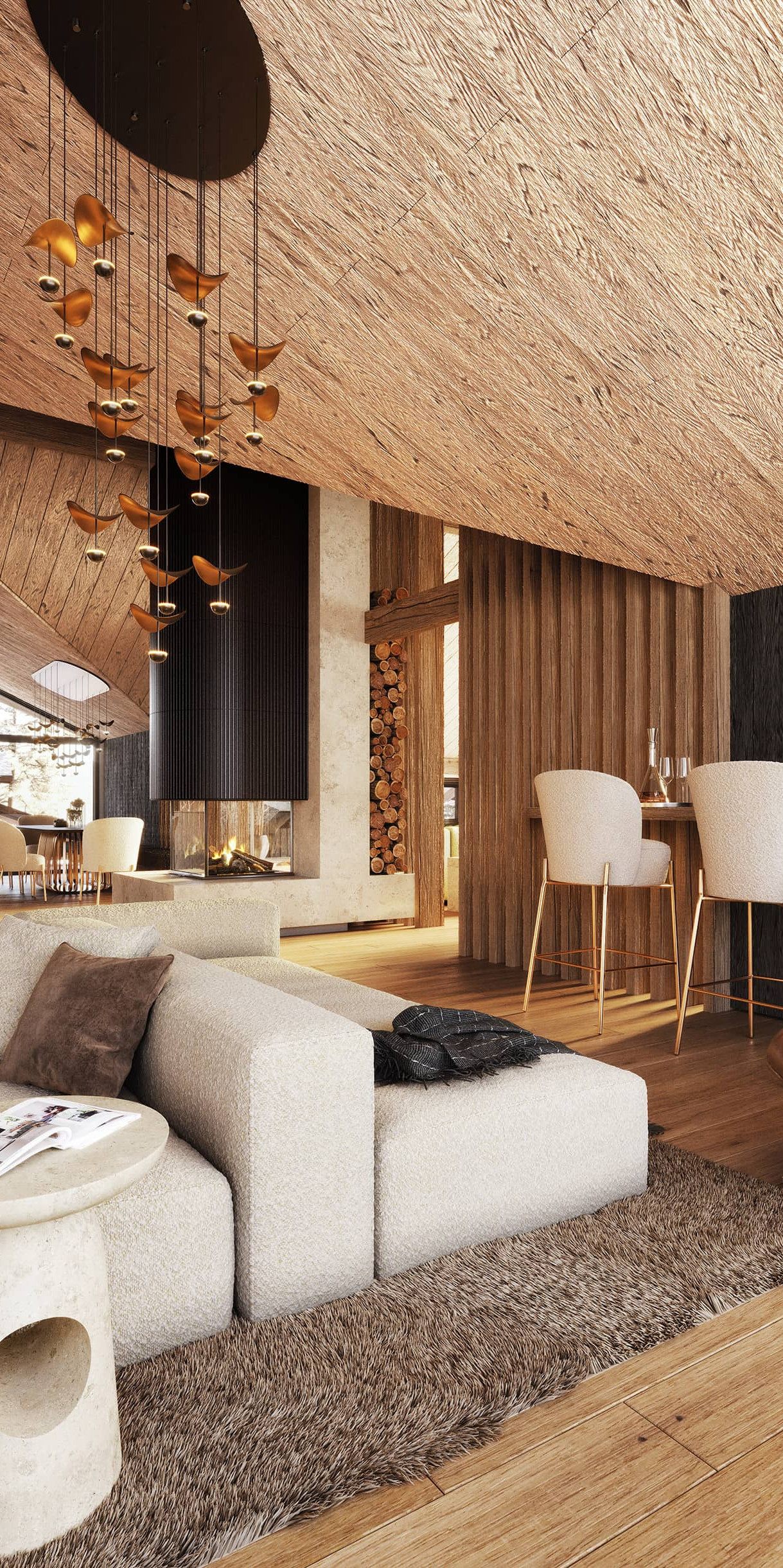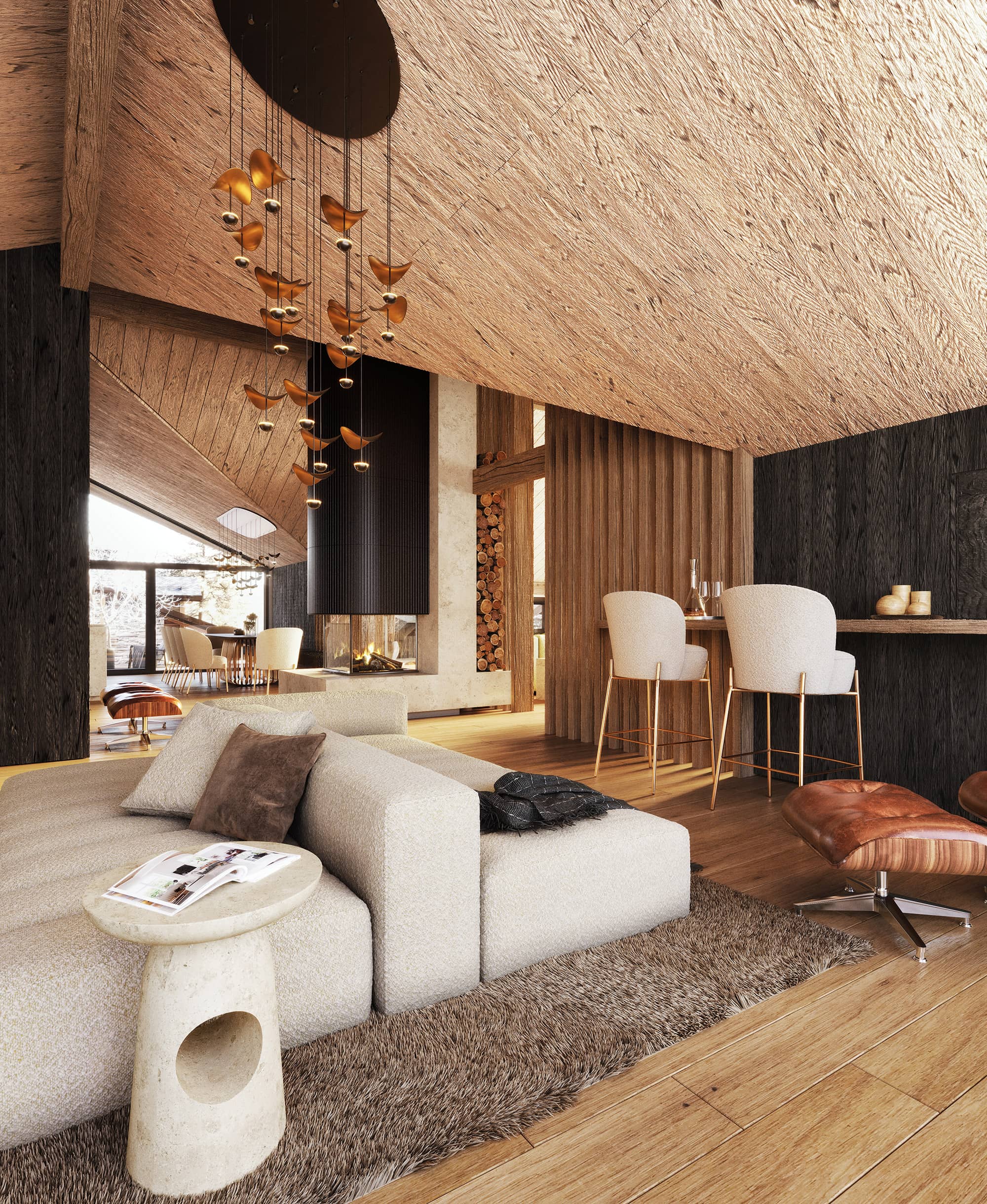 Hier trifft architektonische Großzügigkeit auf alpine Gemütlichkeit: ein offener Kamin, eine (optionale) maßgefertigte Küche, ein Spiel aus Licht und Material. Die Terrassen umfassen den Raum wie ein Amphitheater und öffnen den Blick auf die Leoganger Steinberge.