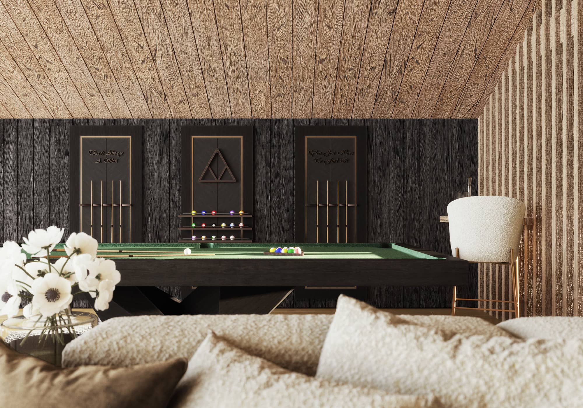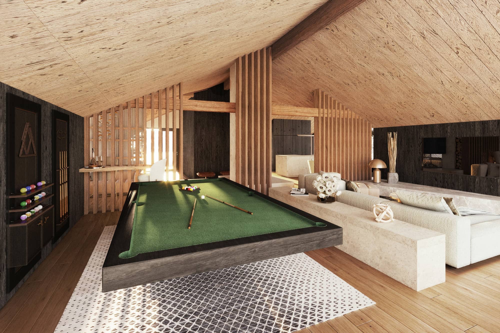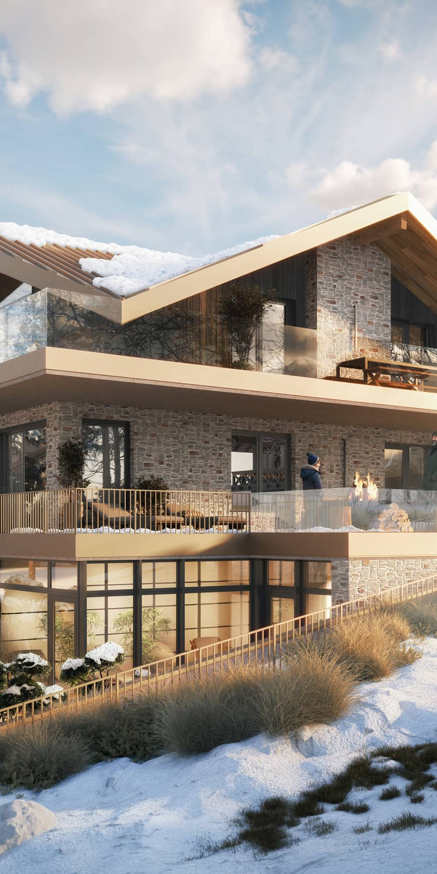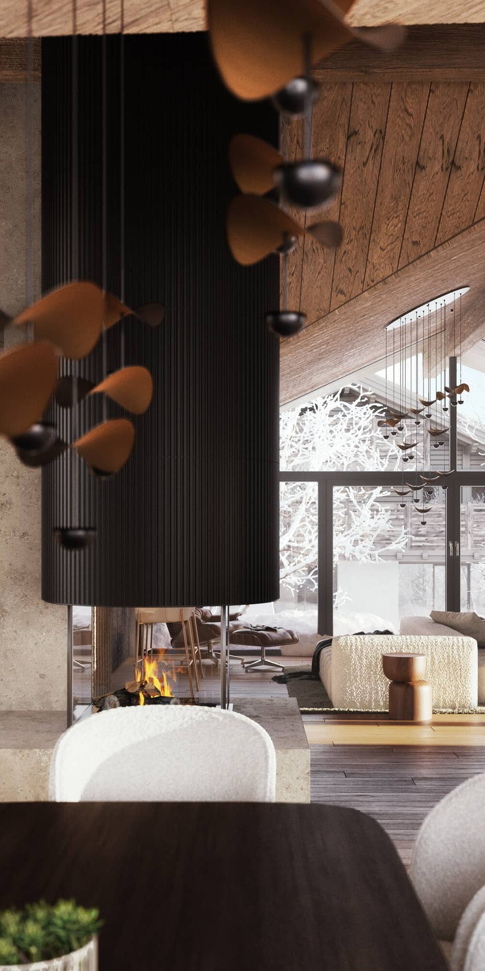 Hier trifft architektonische Großzügigkeit auf alpine Gemütlichkeit: ein offener Kamin, eine (optionale) maßgefertigte Küche, ein Spiel aus Licht und Material. Die Terrassen umfassen den Raum wie ein Amphitheater und öffnen den Blick auf die Leoganger Steinberge.